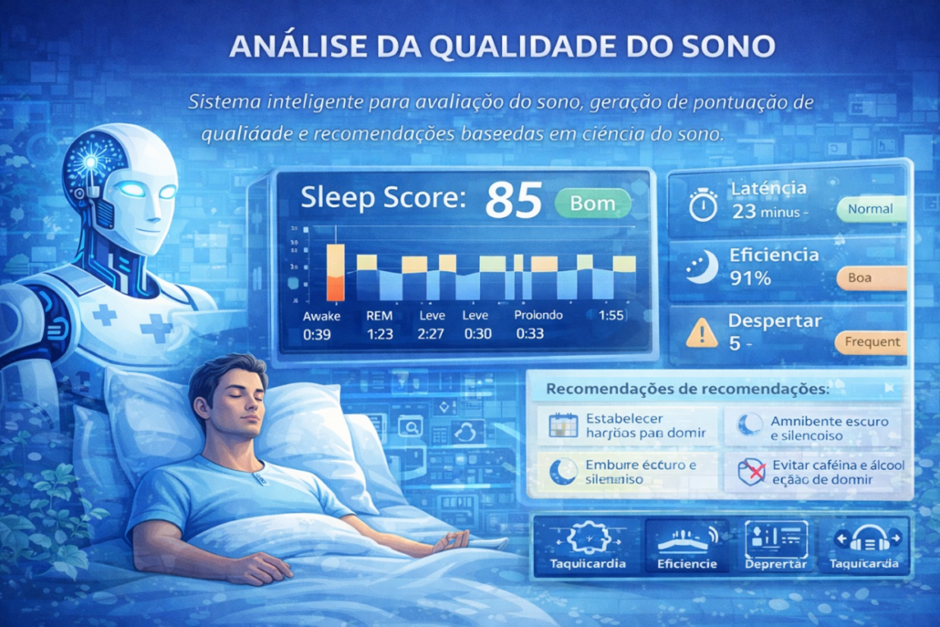 Sistema inteligente para avaliação do sono, geração de pontuação de qualidade e recomendações baseadas em ciência do sono.